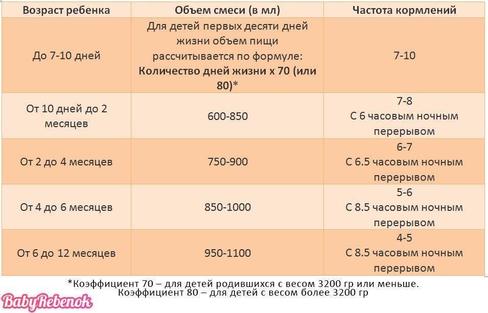 При полном искусственном кормлении проще – на всех банках с питанием предусмотрена таблица кормления новорожденного смесью.