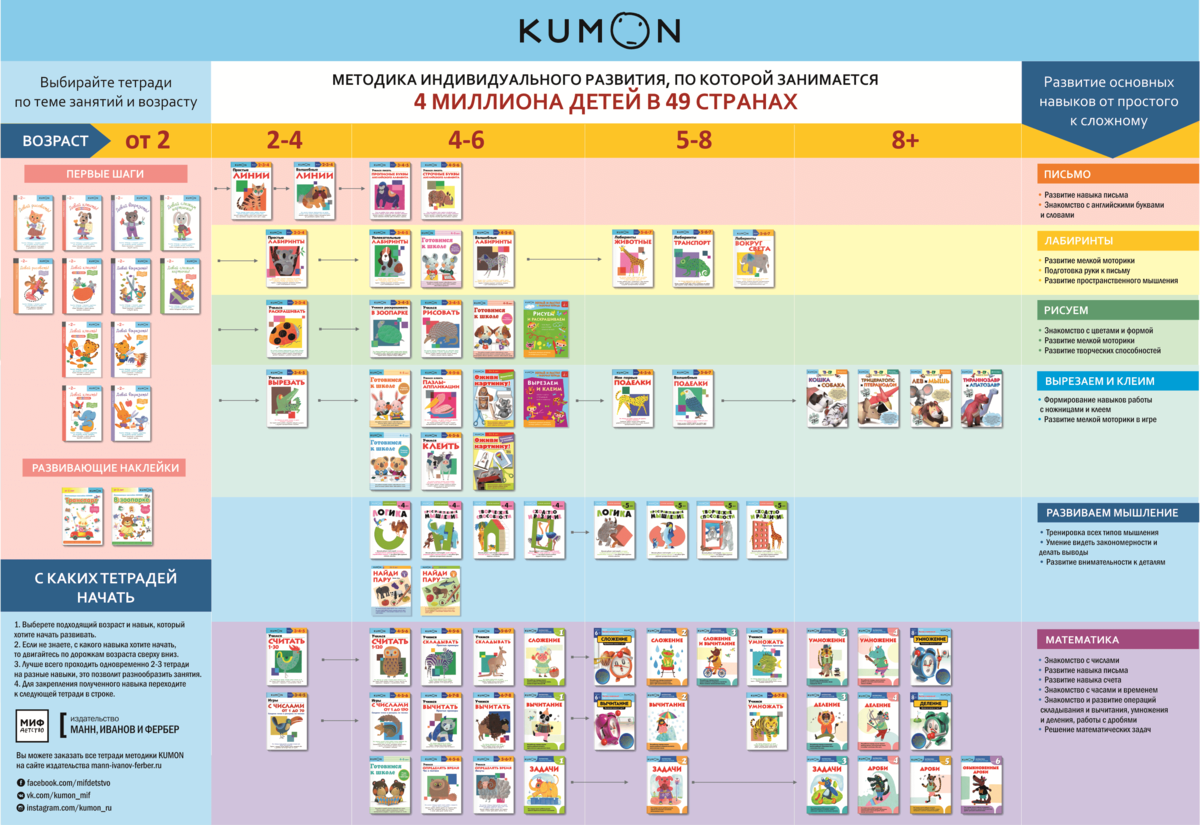 Тетради делятся по сериям, и каждая содержит несколько ступеней сложности с заданиями, которые подходят для того или иного возраста. Чтобы правильно подобрать обучающий материал, ориентируйтесь на возраст ребенка и выберите тот навык, который вы хотите развивать. На русском языке тетради Кумон можно купить на сайте издательства “Манн, Иванов и Фербер”.