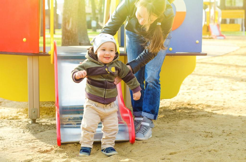Относительно безопасно для ребенка на детской площадке. В то же время именно здесь есть громоздкие качели, высокие турники и горки, спортивные снаряды. Мама должна объяснять малышу правила обращения с ними.