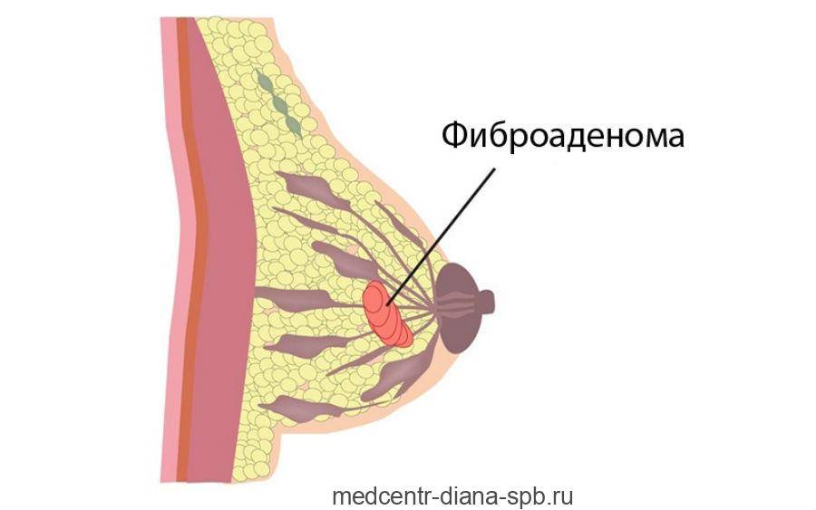 Фиброаденома четко ограничена, пальпируется, смещается по отношению к основанию. Она сама по себе не болит, но из-за давления на соседние структуры или положение в районе нерва может вызвать боль и недомогание. Лимфоузлы в подмышечной области могут быть увеличены.