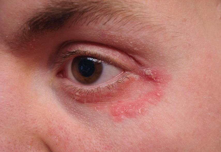 Экзема век характеризуется острым течением. На веках возникают папуло-пустулезные высыпания. Глаза все время слезятся, в уголках появляются трещины.