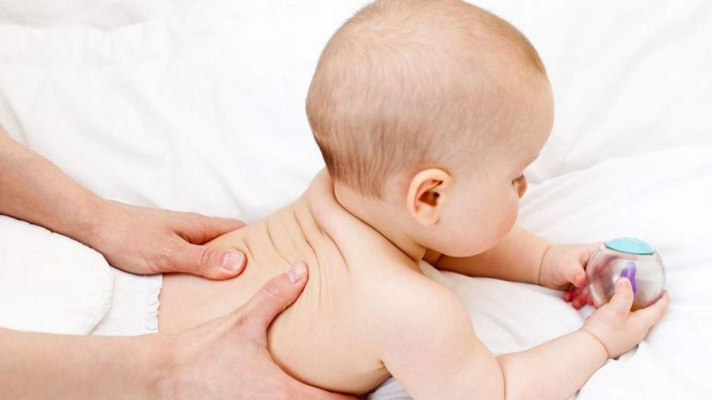 — открытые ладони положите под спинку крохи на уровне поясницы, затем одновременно двигайте их к пупку, пока руки не соединятся — так массируются поперечные и косые мышцы;