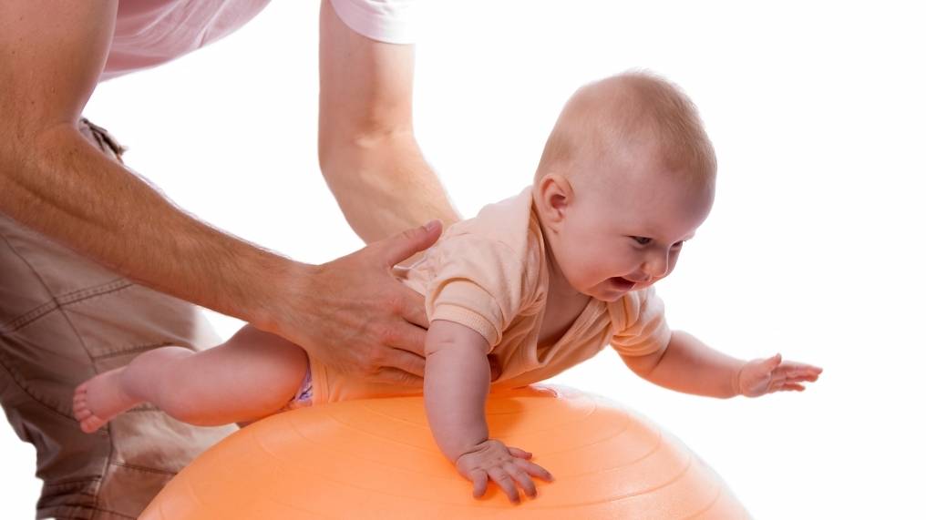 3. Можно купить фитбол и применять его для упражнений. Надув мяч, проверьте, не холодный ли он. Положите малыша на поверхность, разведя его коленки в стороны. Покачайте ребенка из стороны в сторону, придерживая его за спинку. Спокойно и с улыбкой разговаривайте с ним, чтобы карапуз не пугался странного движения.