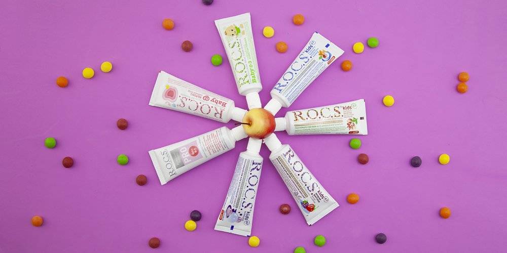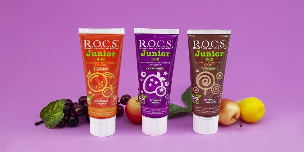 От 6 до 12 лет бренд рекомендует серию R.O.C.S. Junior с аппетитными вкусами «Ягодный микс», «Шоколад и карамель», «Фруктовая радуга». Эти пасты созданы специально для детей в период смены молочных зубов на постоянные. Они защищают от кариеса, укрепляют ткань зубов, оказывают эффективную профилактику воспаления десен. В составе нет парабенов, SLS и фторидов.