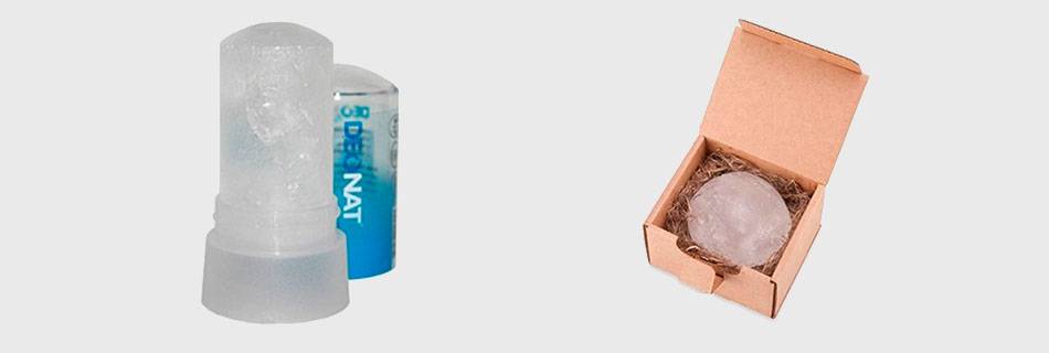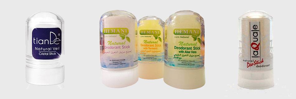 Наиболее безопасными и экологичными считаются дезодоранты-кристаллы. Они не всасываются в кровь, сужают каналы и не блокирует потовые центры. В 100% натуральный состав такого средства входят кристаллы алунита и квасцы. Кристаллические дезодоранты создают антибактериальную тонкую пленку, которая защищает от пота и неприятного запаха. Кроме того, дополнительно квасцы заживляют царапины и ранки на коже, например, полученные при порезах во время эпиляции.