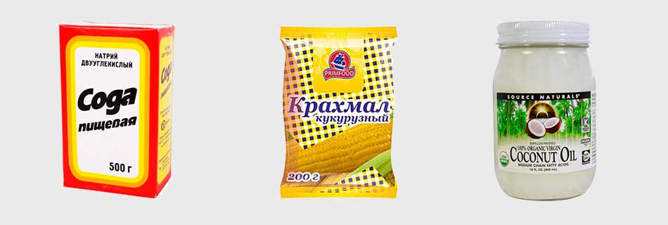 - Крахмал и сода в равных пропорциях (по 60 грамм) смешиваются с кокосовым маслом (6 столовых ложек) до получения однородной массы.
