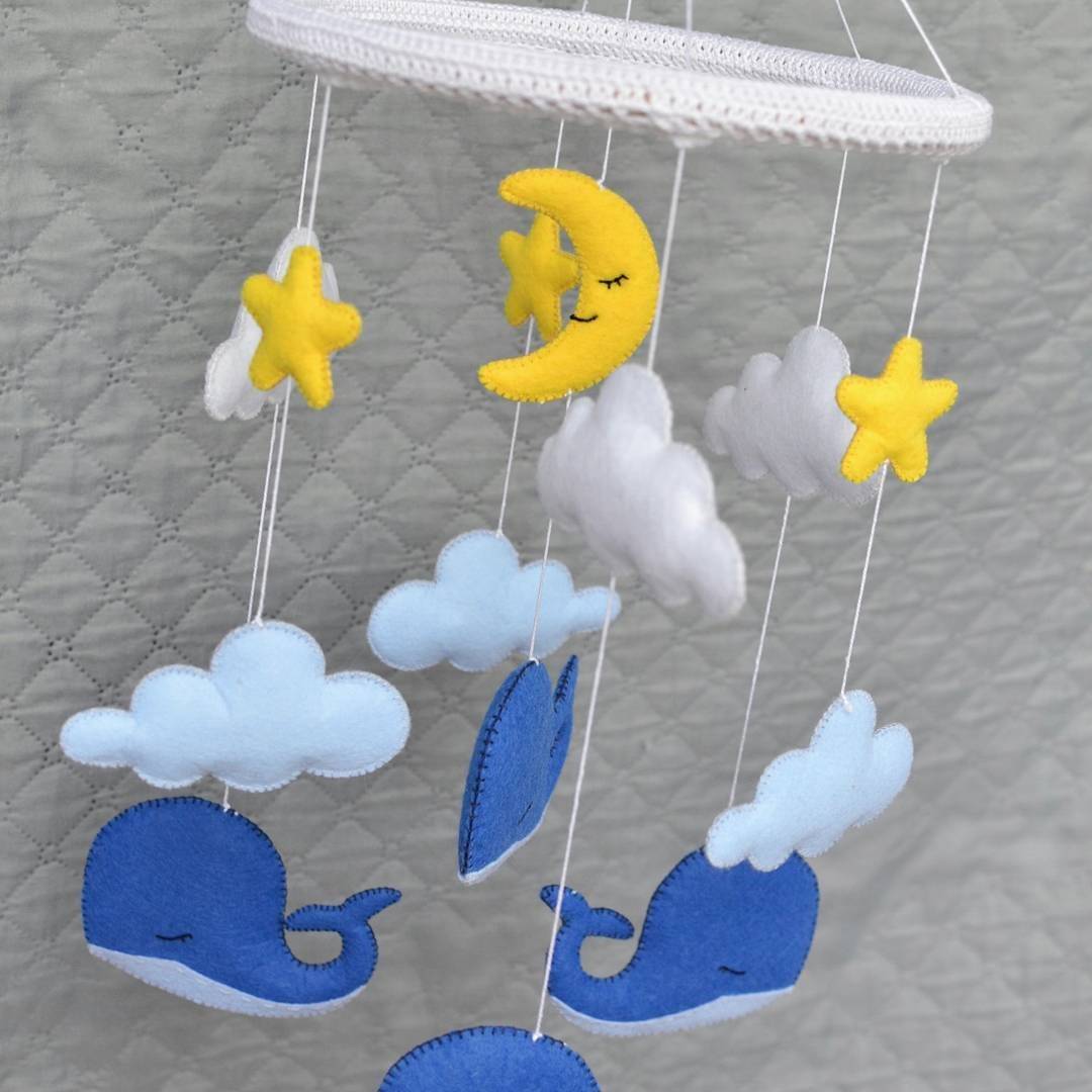 Следующим шагом будет детский мобиль. Его рекомендуется вешать на кроватку, когда ребенку исполнится 5-6 месяцев.