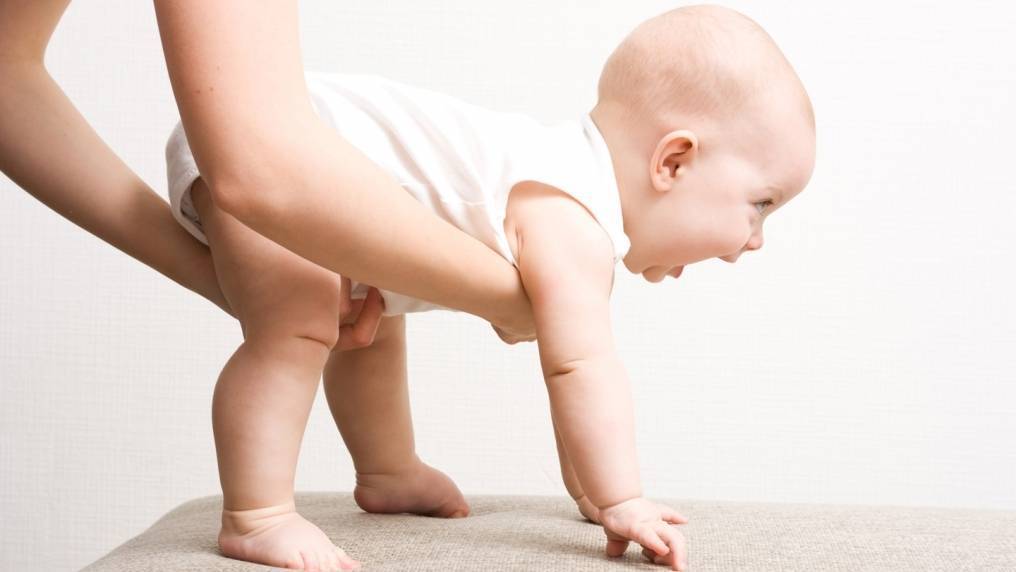 Побуждать попытки самостоятельно становиться на ноги – это тоже задача родителей. Взяв обыкновенный детский стульчик, наклоните его таким образом, чтобы ребёнок, ползающий на четвереньках, мог ухватиться за спинку. После подтяните стульчик немного на себя, следя за тем, как малыш стоит сначала только на коленках, а затем подымается на стопы. При первых таких упражнениях иногда стопы крохи нужно придерживать рукой, чтобы он не отрывал их от пола. Поддерживайте интерес к стоянию игрушками, но не заставляйте стоять слишком долго, мышцы к этому ещё не готовы.