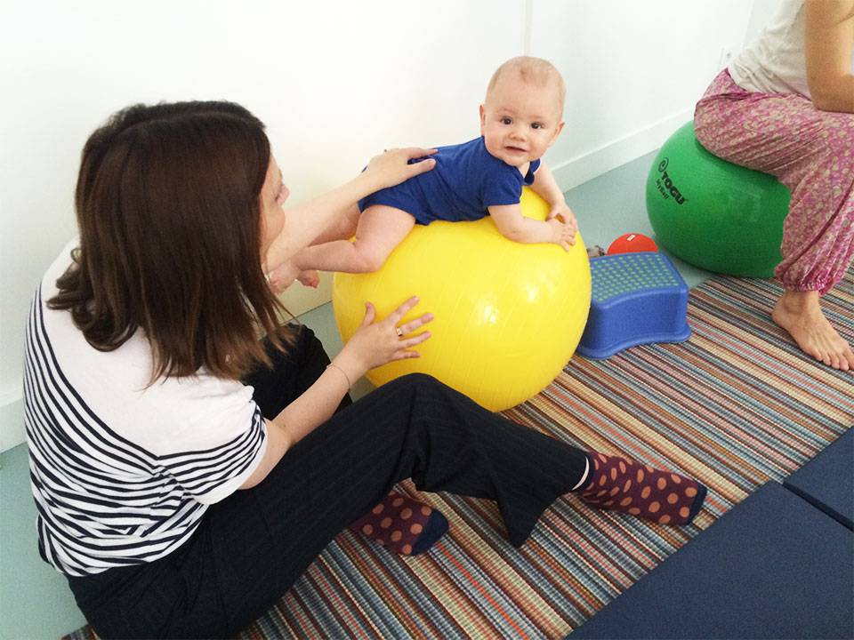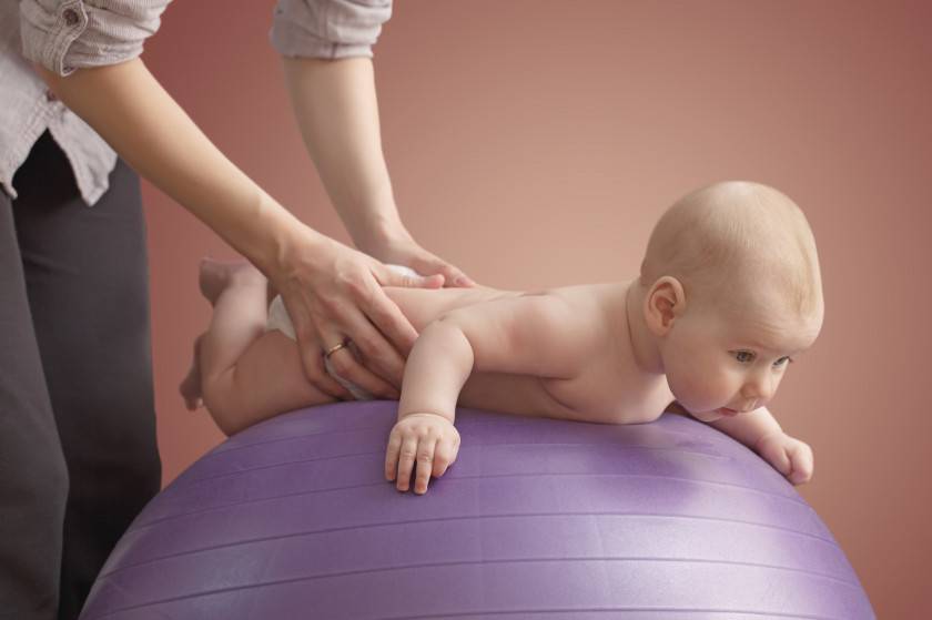 - Упражнения на фитболе одни из самых эффективных. Укладывают кроху животиком на мяч, руками массажист фиксирует ручки ребенка на мяче. Покачивают мяч вверх вниз в течение 2 минут.