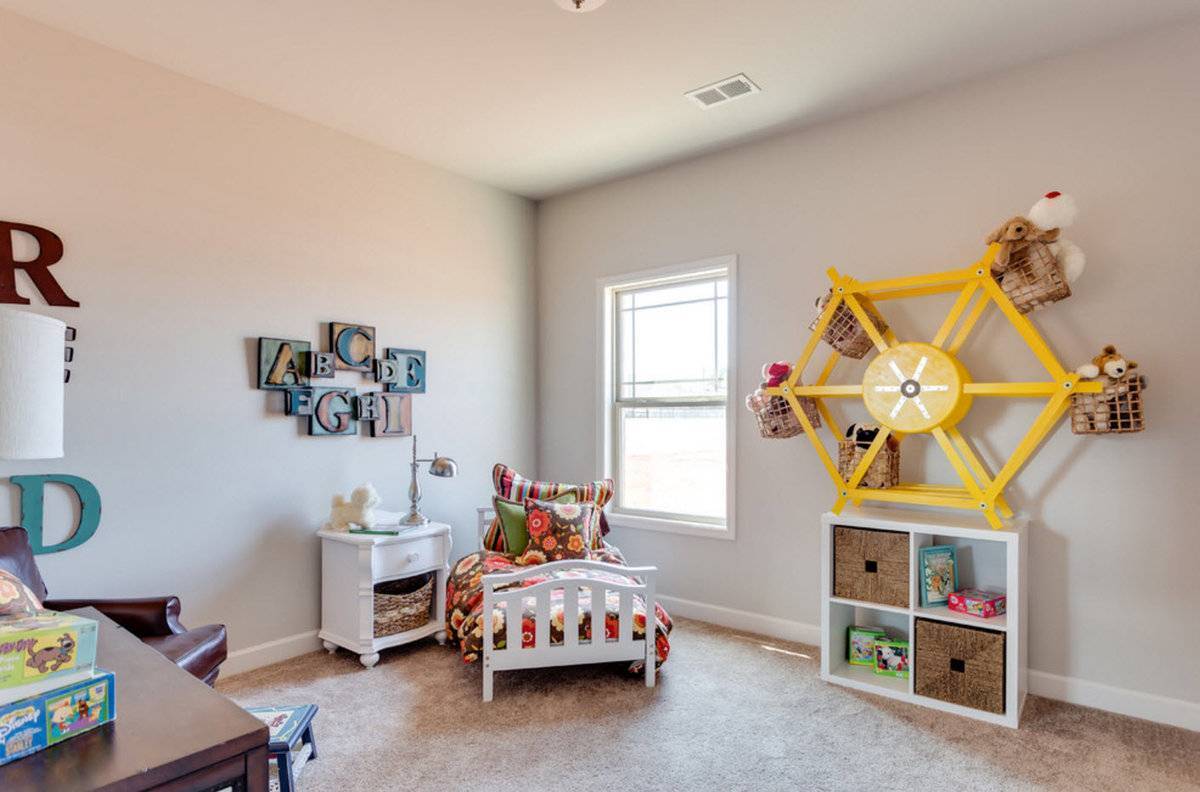 – Закреплённые на стене небольшие ящички или корзинки годятся для легких и компактных игрушек. Главное – не крепить их высоко, чтобы малыш сам мог в них покопаться.