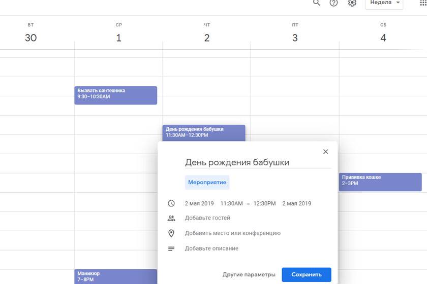 Другой вариант — вносить дела в электронный календарь, например, в Google. Он хорош тем, что в назначенное время пришлет напоминалку в телефон или на почту. А еще там можно установить периодичность событий — раз в неделю, месяц или год.