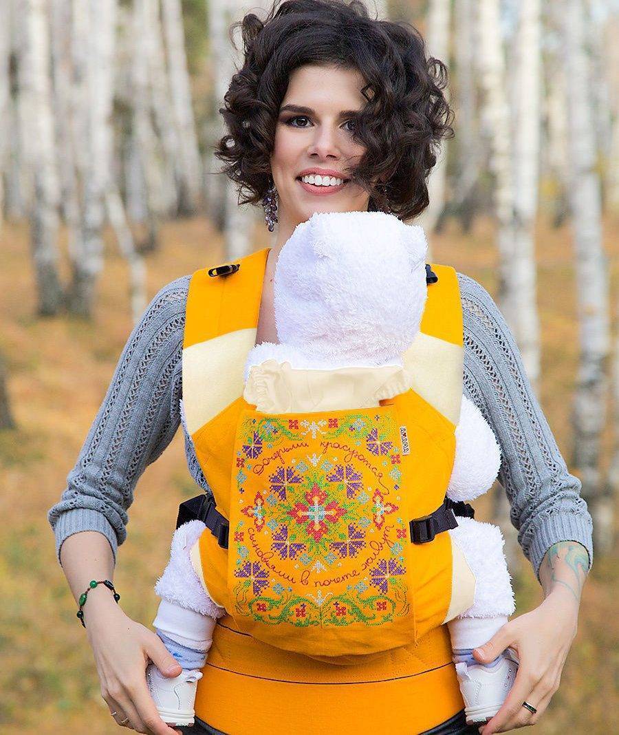 Сделан почти пополам из льна и хлопка. Также называется «этно». Это связано с его солнечно-жёлтым цветом и народным вышитым узором с поговоркой. Спинку можно утягивать, подгоняя под ребёнка. Имеется вместительный карман. Подходит от четырёх месяцев. Стоимость – около двух тысяч.