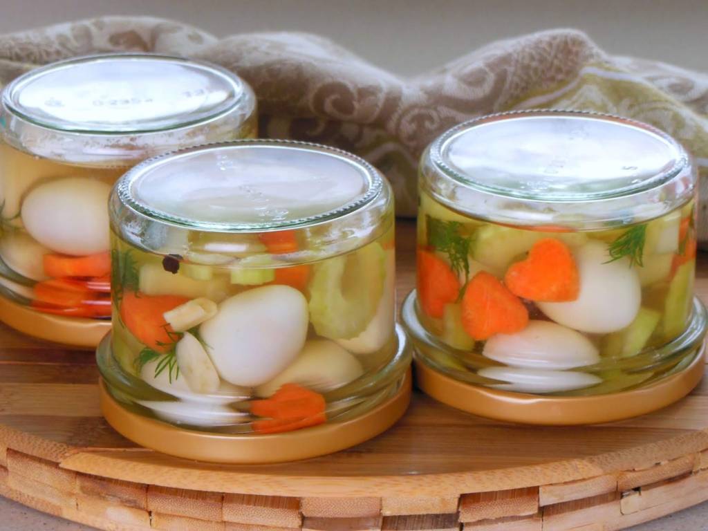 В банку укладывают очищенные перепелиные яйца, пересыпая их рубленой зеленью и чесноком. Отдельно готовят маринад, для чего в кастрюлю с водой добавляют лаврушку, перец горошком, а также соль и сахар. Все кипятят 3-4 минуты, и, сняв с огня, вливают уксус. Теплым маринадом заливают яйца, и через два дня пикантная закуска готова.
