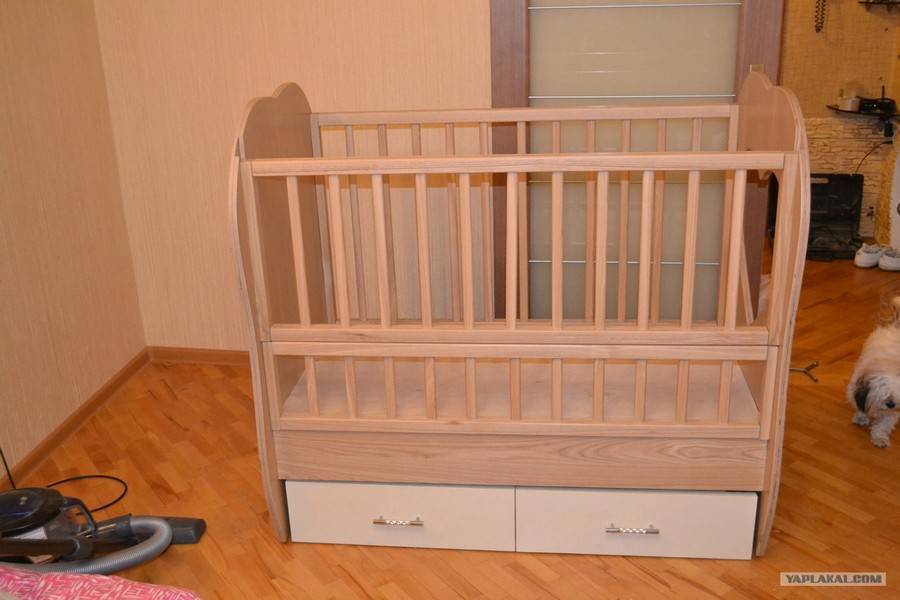 Для того чтобы получить кроватку-качалку, вместо широких бортов можно сделать четыре ножки, а к ним прикрепить качающуюся основу. В таком случае придется отказаться от ящиков для хранения.