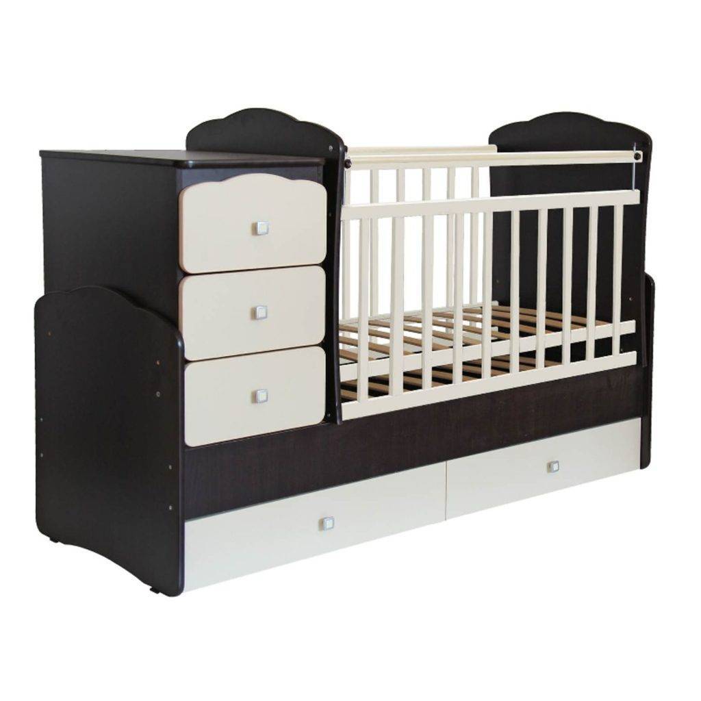 Изделие из натурального дерева и ДСП с поперечным маятником удобно и функционально. Конструкция включает наличие колыбельки для младенца, подростковой кровати, пеленального столика, тумбы и столика с бортами, на которые нанесены безопасные силиконовые накладки. Ортопедическое ложе состоит из трех основных положений. При помощи маятника малыш уснет быстрее. Тумба с 3 емкими ящиками и столик для пеленания размещается с левой или правой стороны. В будущем, когда малыш станет старше, конструкция легко превратится в столик для детского творчества. Фасадную планку можно опустить при помощи кнопочного механизма.