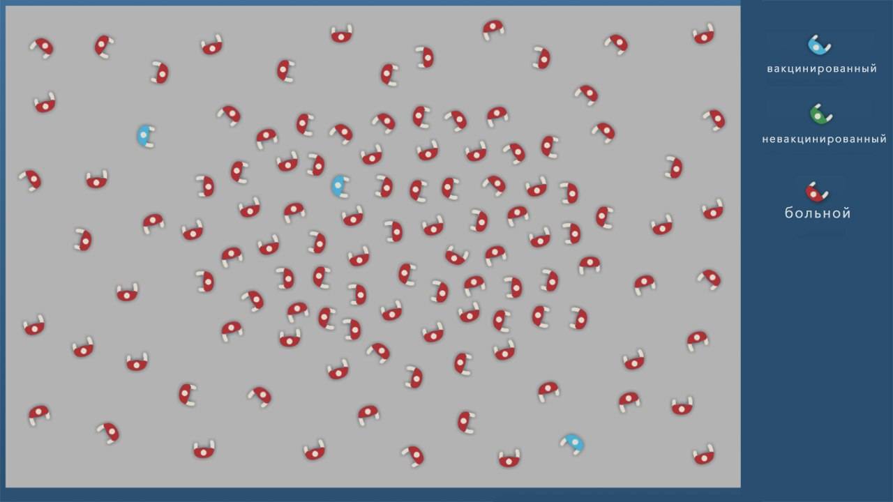 Формирование коллективного иммунитета. Когда большая часть (не менее 70%) населения привита, инфекция перестает распространяться, и новых случаев заражения нет. При этом вакцинированные люди защищают непривитых, составляя их ближайшее окружение (рис. 1)