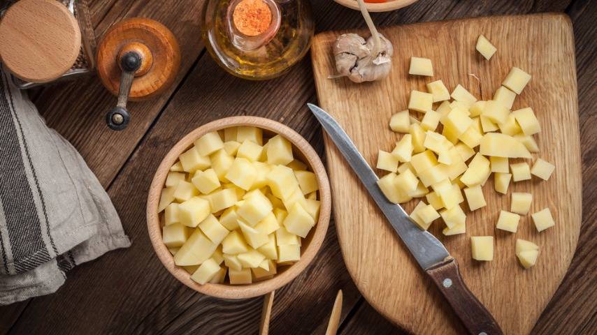 Этот способ приготовления более щадящий для всего полезного состава картофеля. Но в нем при такой обработке сохраняется и крахмал. Если на него аллергия, то прежде чем приступать к готовке, очищенные клубни необходимо вымочить в холодной воде.