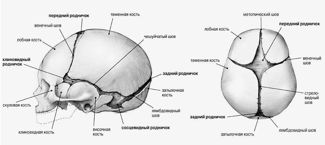 Как известно, череп состоит из многих костей, соединенных между собою швами (они представляют собой не ровные, а зазубренные, зигзагообразные линии). Во внутриутробном периоде кости скелета закладываются как пластинки плотной перепончатой ткани, которые позднее заменяются на хрящевую ткань, а затем — на костную. Окостенение плоских костей крыши (верхней и боковых частей) черепа, в отличие от длинных трубчатых костей конечностей, минует стадию хряща, т.е. точки окостенения появляются в центре перепончатых пластинок. В последующем процесс окостенения распространяется в стороны, захватывая все большую площадь каждой кости, пока не достигает ее краев. Этот процесс почти целиком происходит еще в период внутриутробного развития, поэтому большая часть крыши черепа к моменту рождения малыша уже представлена костной тканью, хотя последняя и значительно отличается от костной ткани взрослых: она гораздо более тонка, эластична, богата кровеносными сосудами