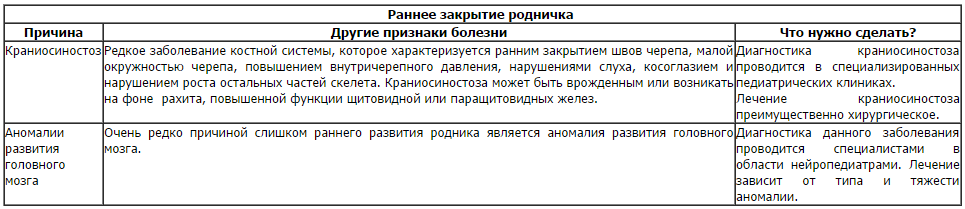 - Зарастание родничка раньше срока может говорить об избытке кальция. а также свидетельствовать о таких заболеваниях, как краниостеноз, микроцефалия;