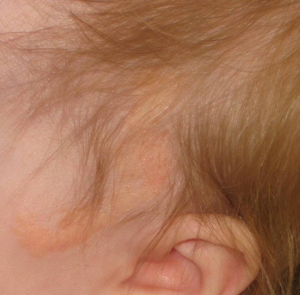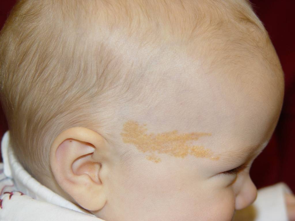 Он обычно присутствует уже при рождении, но может появиться и позднее. Характеризуется появлением одиночных, четко ограниченных, овальных или линейных зон облысения, восковидных , от желтого до желто-коричневого цвета. Поверхность может быть бархатистой или бородавчатой, реже медуллярной или в виде папиллом. Размеры варьируют от нескольких миллиметров до нескольких сантиметров в длину. До полового созревания образования увеличиваются в размерах пропорционально росту ребенка, в период полового созревания они становятся более выпуклыми, более напоминающими бородавки, и более блестящими.