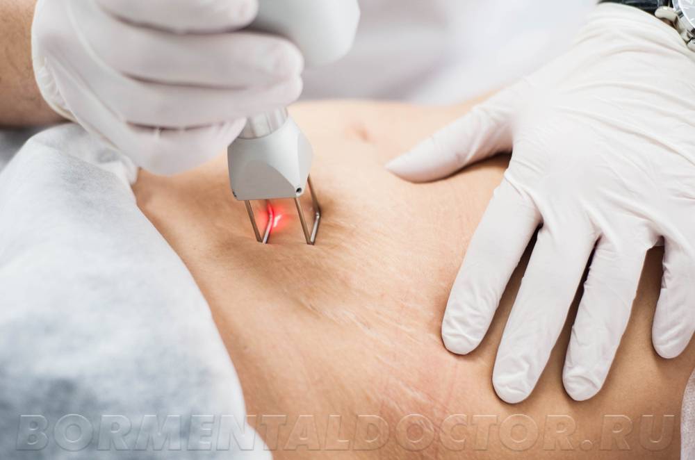 - С помощью лазерной установки врач наводит луч лазера на поврежденные участки кожи, который удаляет растяжки.