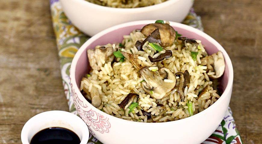 Для приготовления этого блюда понадобится 300 г шампиньонов, 200 г рисовой крупы, одна луковица небольшого размера и крупная морковь, растительное масло для жарки.