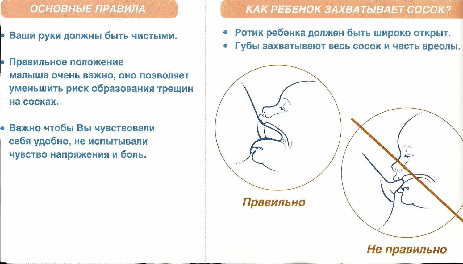 Захват груди и сосание — это рефлексы. Чтобы стимулировать их, мамочка может первые 2-3 раза поводить ареолой (но не соском) по губам ребенка. И тогда он сам поймет, что нужно брать грудь. Вы можете также первые разы чуть помочь ему, повернув головку в нужном направлении. Ребенок, захватывая ареолу, должен открыть рот широко. Снизу он захватит большую площадь ареолы, чем сверху.