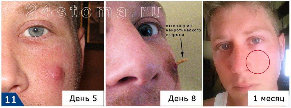 3) На третьей стадии начинается регенерация тканей. Эта стадия начинается после опорожнения гноя из полости фурункула и отторжения некротического стержня. Припухлость тканей и воспаление на этой стадии постепенно уменьшается, а заживление тканей происходит с образованием небольшого рубца. В следующем разделе мы подробно опишем – как лечить фурункул на разных этапах воспалительного процесса.