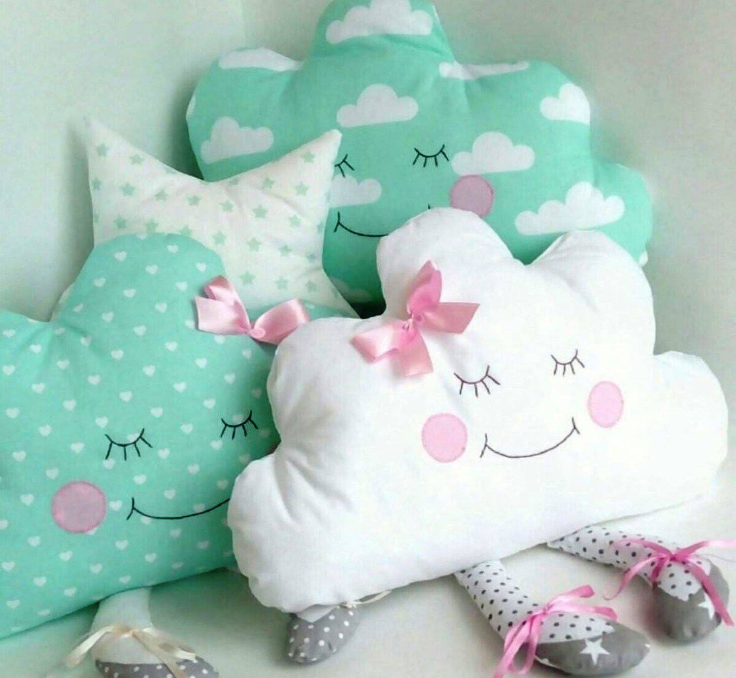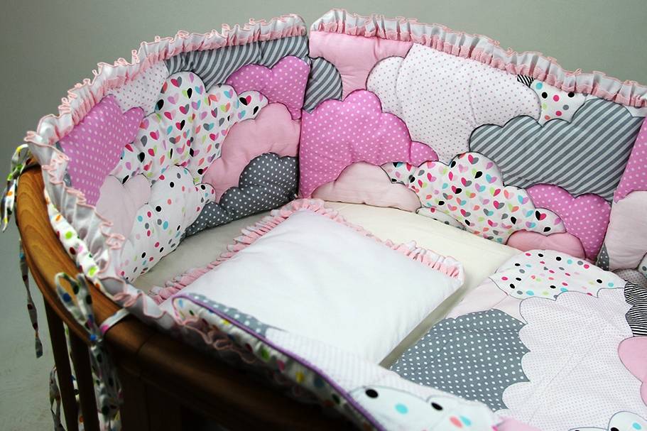 Облачка – очень популярная среди мам форма бортиков. Это по сути бортики в виде небольших подушек в кроватку для новорожденного крохи, но каждая подушечка имеет форму облачка. Такие бортики лучше делать из ткани нежного оттенка, сочетать белый с голубым, розовым, кремовым. Выглядят такие облачка невероятно нежно, а шьются очень просто! Вам даже не понадобится выкройка, просто вырежьте из ткани облачко – нижняя часть плоская, а вверху бугорки, и готово!