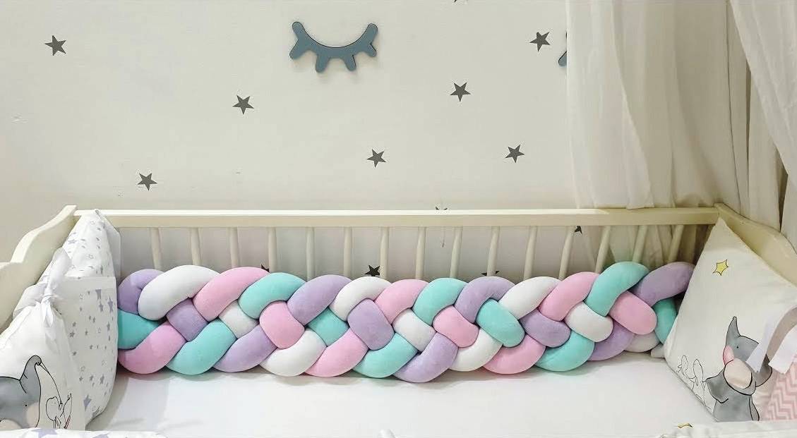 Название говорит само за себя: бортик в виде косички выглядит, как большая мягкая коса, сплетенная из трех толстых тканевых валиков. Делается она несложно, особенно если у вас есть швейная машинка. Нужно просто сшить три длинных колбаски из мягкой ткани, причем лучше, чтобы ткань немного тянулась, тогда косу сплести будет проще. Наполнить «колбаски» мягким наполнителем, сшить у основания и связать косичку, а второй конец тоже закрепить нитками.