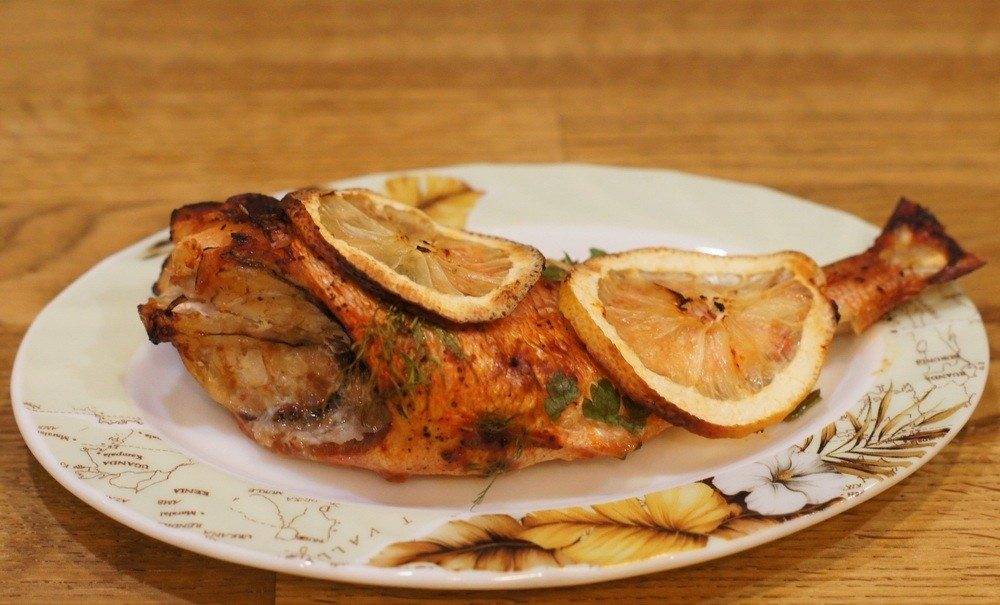Смешиваем масло с лимонным соком, солью и специями. Смазываем маринадом подготовленную тушку с каждой стороны. Лук почистить и порезать на полукольца, половину лимона – на половины кружков. Противень смазать растительным маслом, выложить лук, а затем – рыбу. В тушке делаем неглубокие надрезы, куда укладываем лимонные дольки. Помыть и порубить петрушку, посыпать сверху либо положить внутрь рыбы. Выпекать сорок минут при температуре 180 градусов.