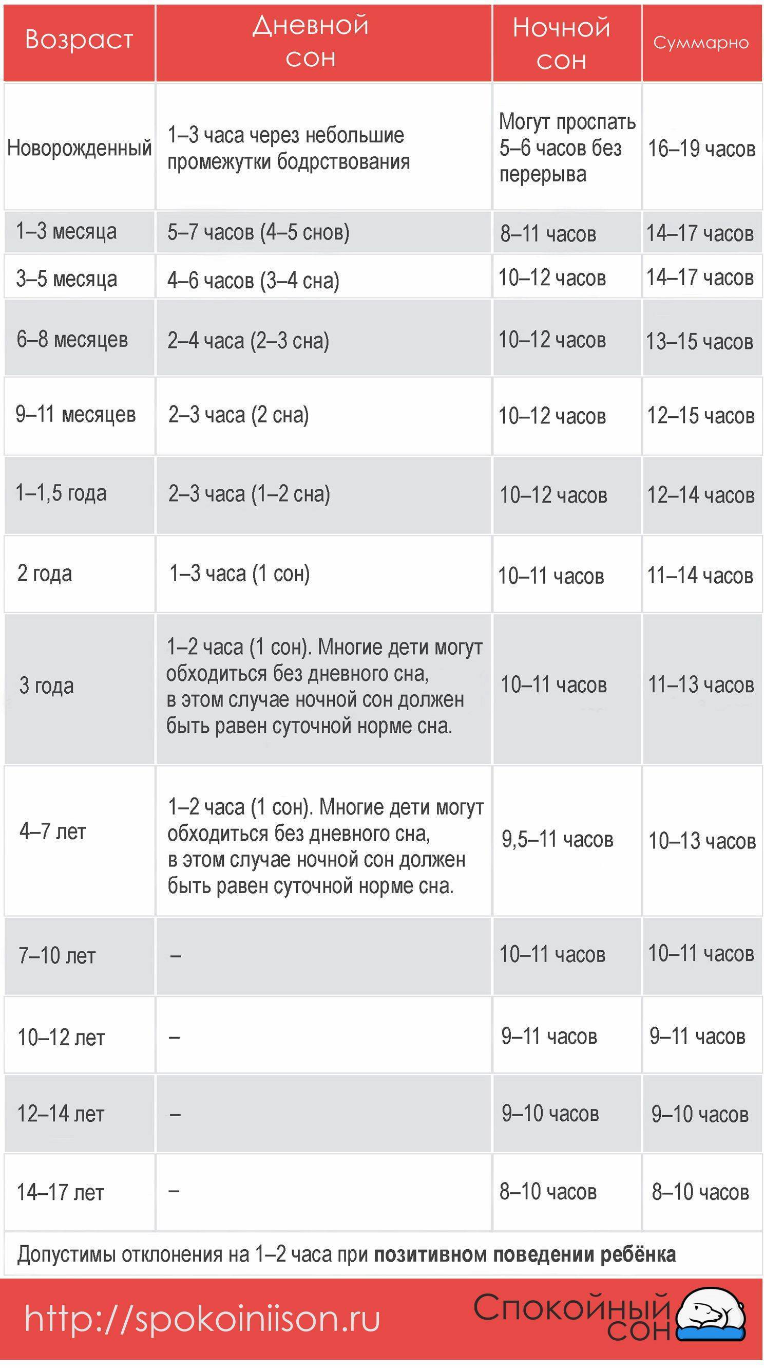 В таблице приведены суточные нормы сна в зависимости от возраста: