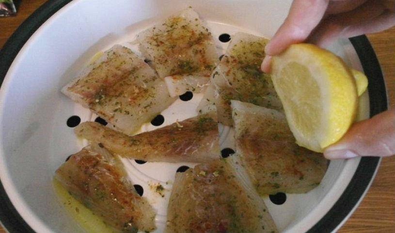 Для приготовления в пароварке потребуется филе судака, нарезанное небольшими кусочками, 3 чайных ложки лимонного сока и специи – по вкусу.