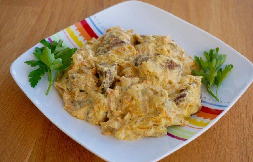- Сметану смешивают с мукой. Затем ее добавляют к печени и варят около 20 минут.