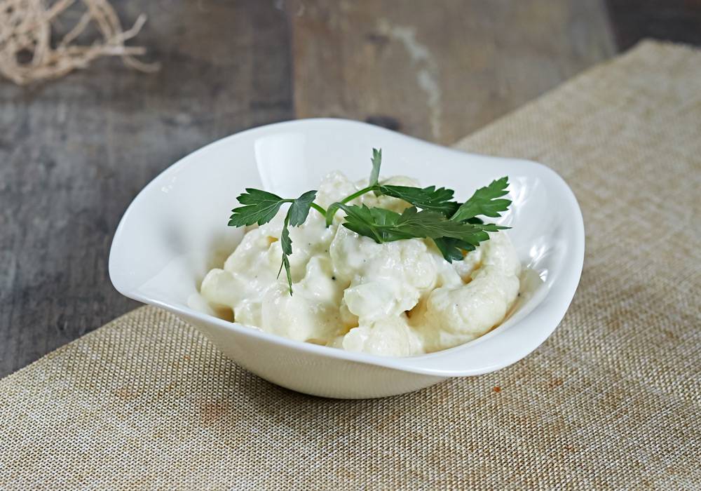 Цветная капуста является кладезем микроэлементов. Чтобы приготовить салат из этого продукта, необходимо разделить его на соцветия, после чего отварить их до готовности в соленой воде. Готовность можно проверить с помощью вилки – капуста должна стать мягкой. Затем следует слить жидкость, капусту остудить. После этого сваренные соцветия посолить, сбрызнуть соком лимона, заправить сметаной невысокой жирности, перемешать. Можно добавить немного зелени.