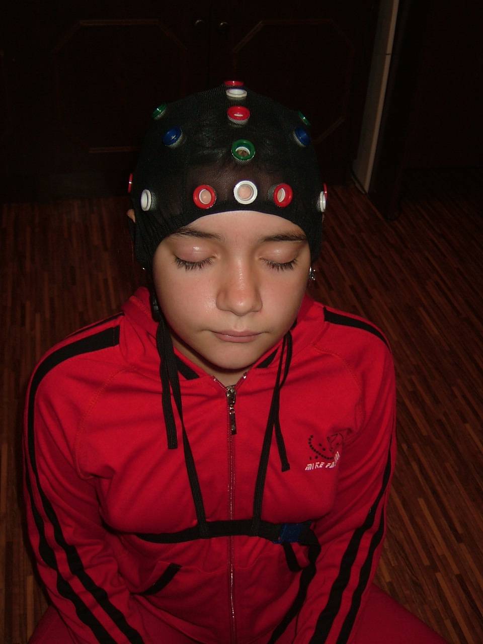 Для проведения ЭЭГ головного мозга у детей используют комнату, по возможности не пропускающую свет и звук. На голову пациента перед исследованием надевают специальную шапочку с датчиками, которые передают сигналы на прибор (электроэнцелограф).