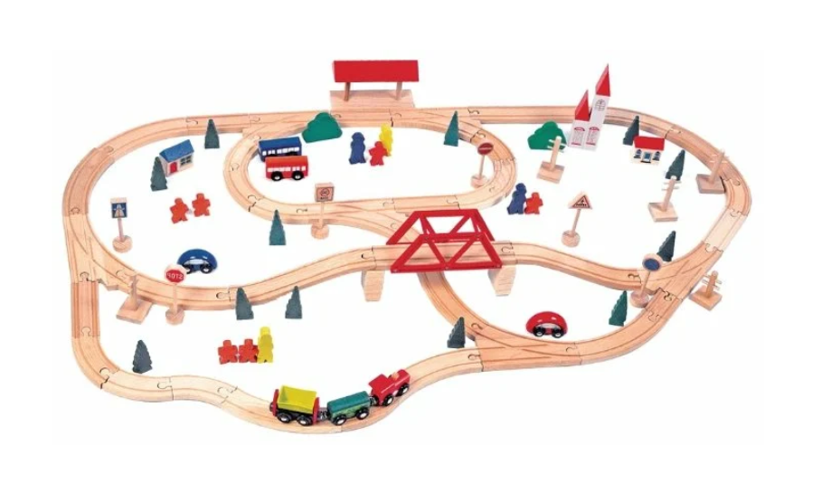 Заключительный участник обзора отличается не только материалом изготовления, но и наличием оригинальных деталей. Дорога и все элементы, которых в наборе 90 штук, выполнены из экологически чистого дерева высокой прочности. В состав комплекта входят мост, деревья, поезд, фигурки людей, знаки, здание вокзала.